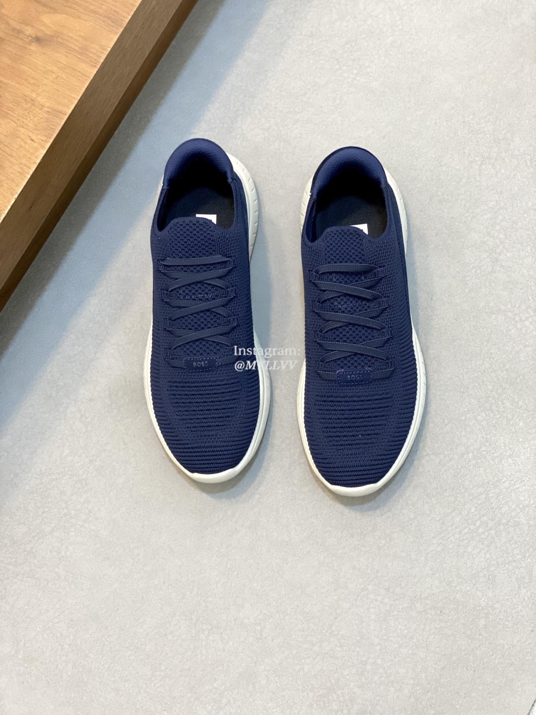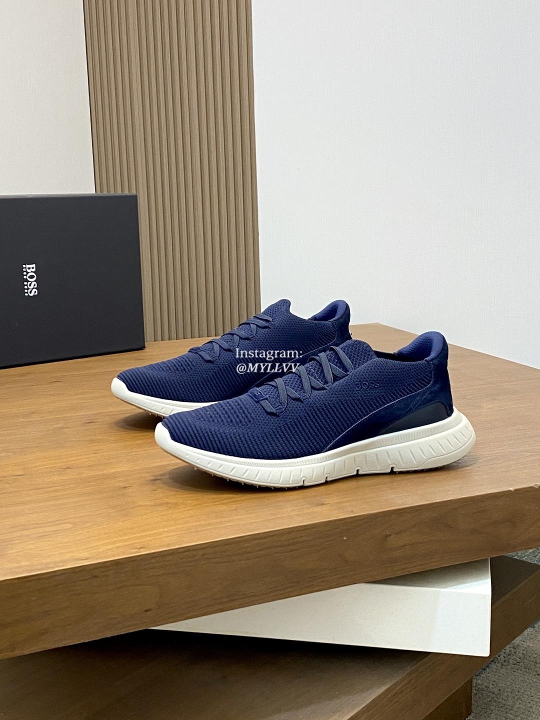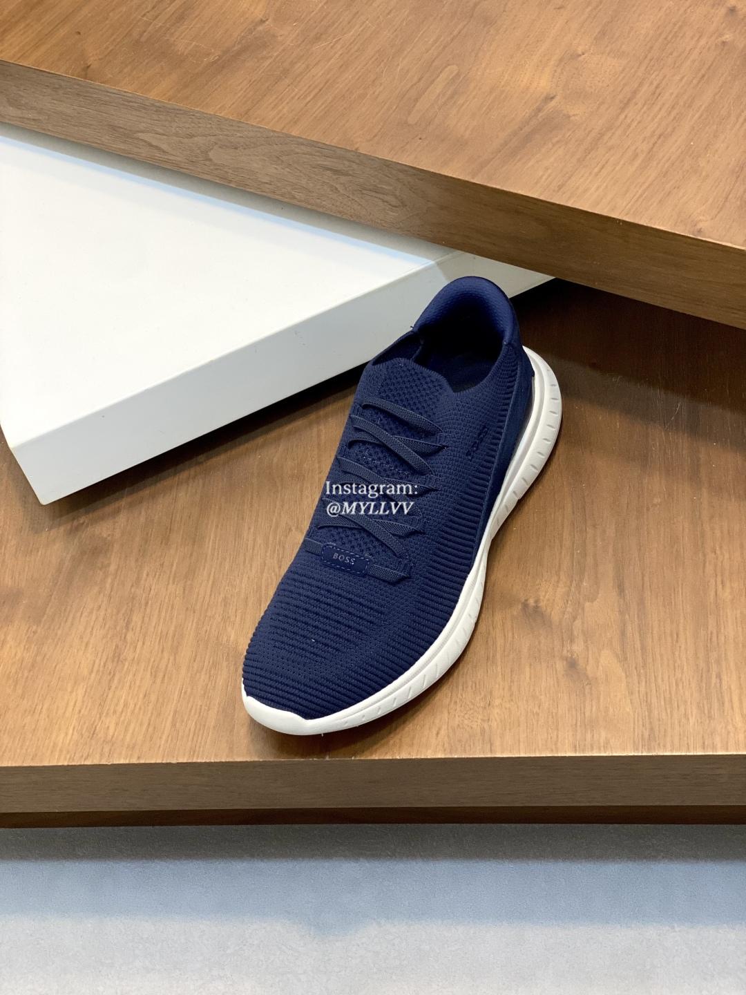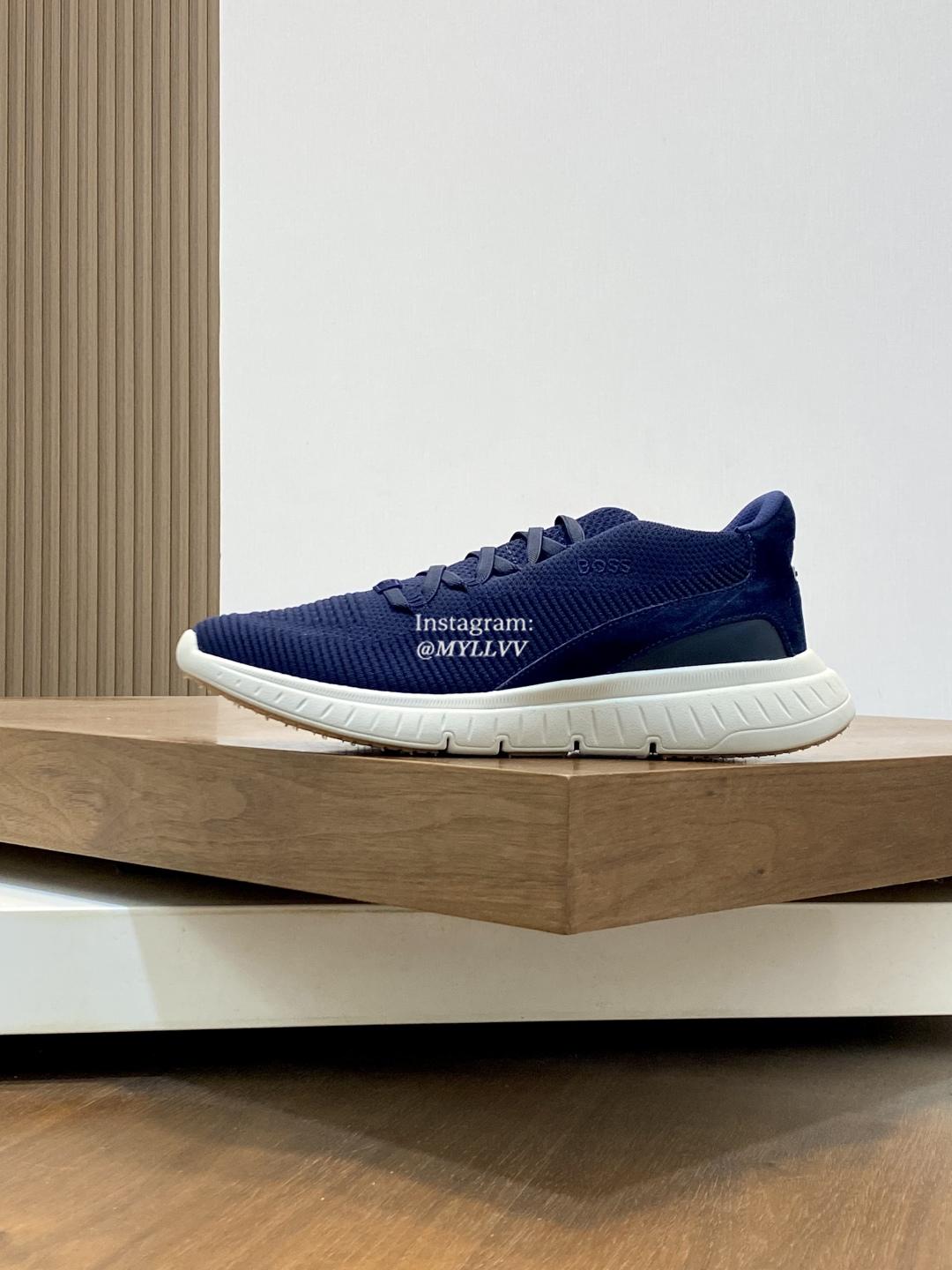The shoe design is simple and smooth, fashionable and versatile. The upper of the shoe is made of high elasticity knitted material, which is lightweight and breathable, fits the foot well, and provides a comfortable wearing experience. Knitted BOSS logo details, composite splicing, suede leather decoration/calf leather patch embellishment, rubber label tri color logo, heel details, full mesh lining with ultra light rubber sole, excellent breathability and elasticity.