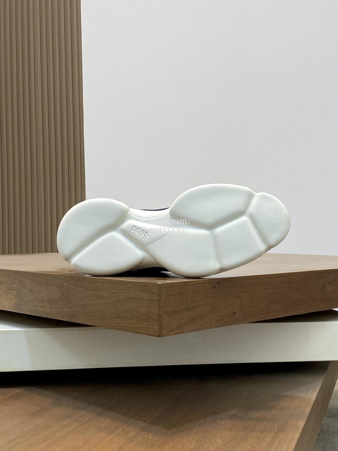 This sports shoe is made of textured canvas leather spliced with cashmere knitted fabric. The upper is embedded with the same color calf leather trim, crafted with a lightweight EVA shaped thick sole. The cotton shoe strap is paired with metal enamel eyelets, and the outer side is embossed with the “BOSS” print logo. The tongue is decorated with a genuine leather logo, and the heel is decorated with a woven shoe lifting loop. The fabric cotton lining and footrest have an explosive texture and excellent workmanship, making it super lightweight, comfortable, and breathable when worn.